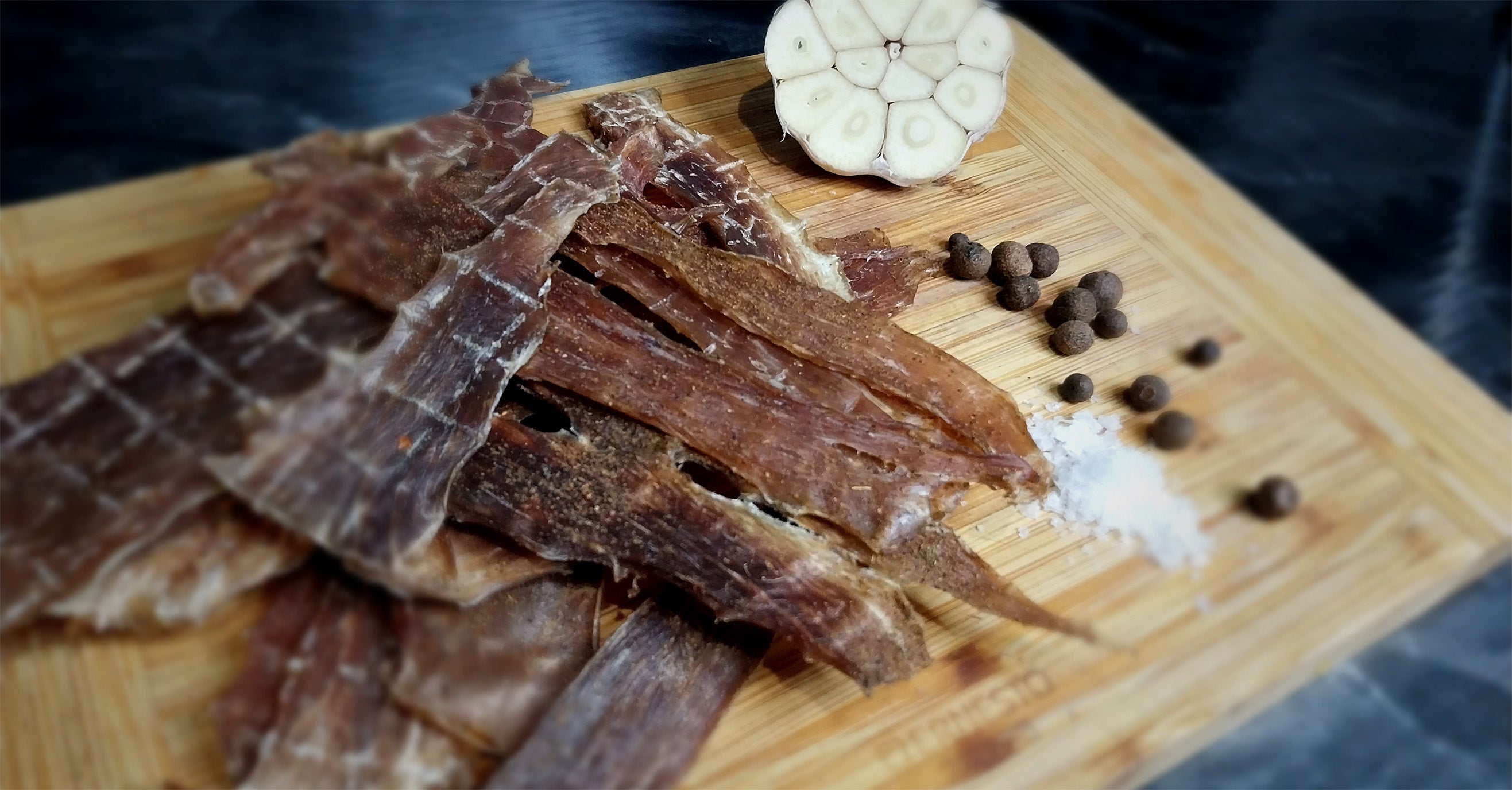 Mūsų produktų gamyba yra kruopštus procesas, apimantis 36 valandas brandinimo marinate, po kurio atliekamas 14 valandų sausas vytinimas pakankamai žemoje temperatūroje, išsaugant naudingas maisto medžiagas. Rezultatas? Užkandis, pasižymintis maksimalia baltymų koncentracija, maloniai traškia tekstūra ir visiškai be pridėtinių skonio stipriklių ar konservantų.